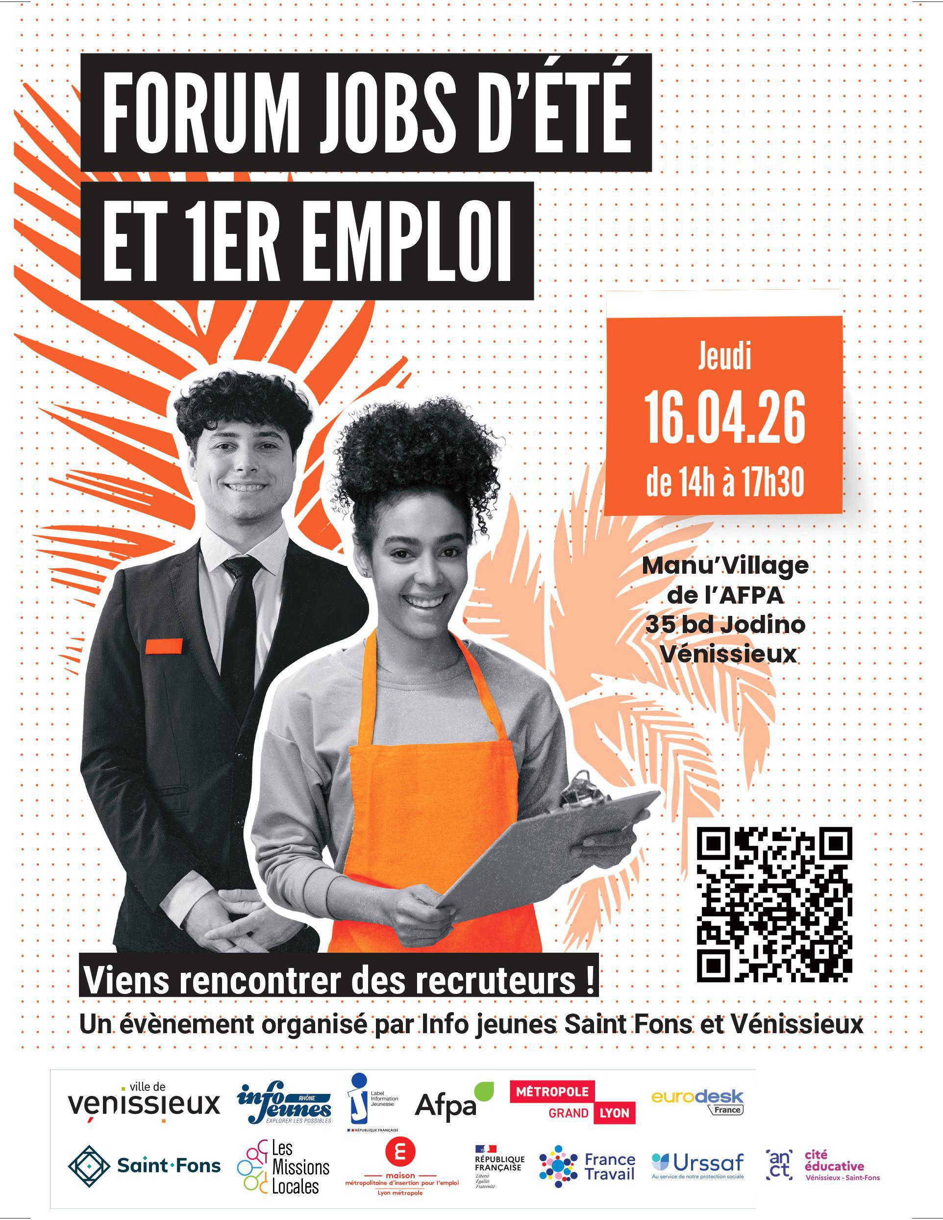 Évènement organisé par Info-jeunes de Saint-Fons et Vénissieux, les Villes de Saint-Fons et Vénissieux en partenariat avec la Métropole de Lyon, France Travail, les Missions Locales, l’AFPA, la MMI'e et l’ensemble des partenaires jeunesse des deux communes.